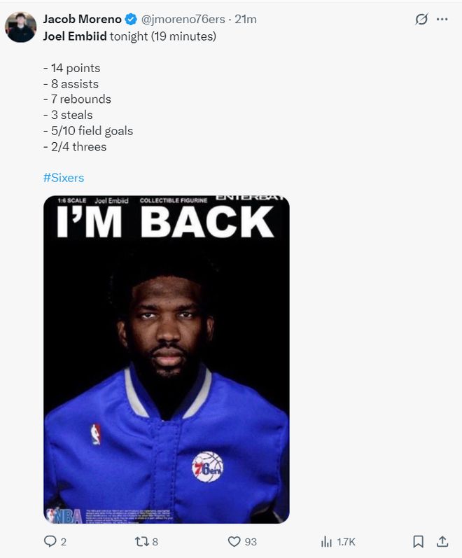 賽前ESPN記者蕾夢娜-謝爾伯恩就表示:恩比德的康復實際上超過了預期,他可以在新賽季開始前重返賽場對于費城來說是一個巨大的利好。
